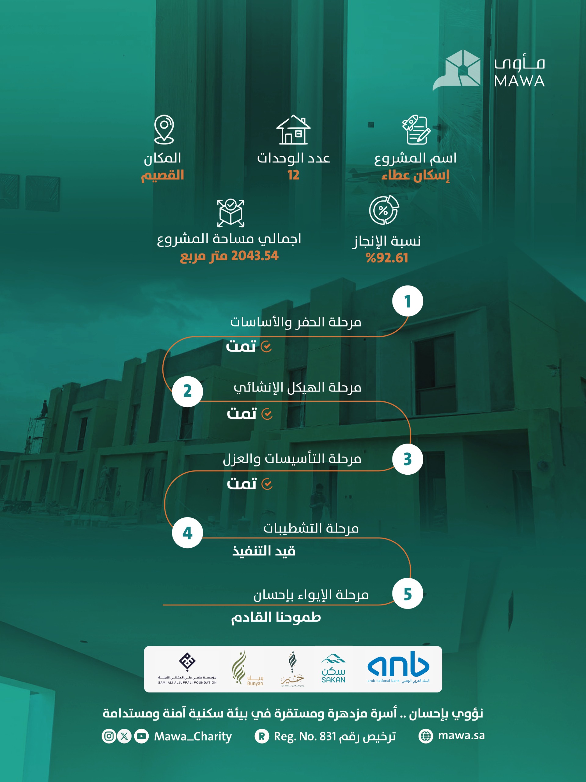 مراحل تُنجز… بخطى ثابتة مشروع إسكان عطاء بمنطقة القصيم ، يسعى المشروع لتوفير 12 وحدة سكنية آمنة ومستدامة بمساحة اجمالية2043م .