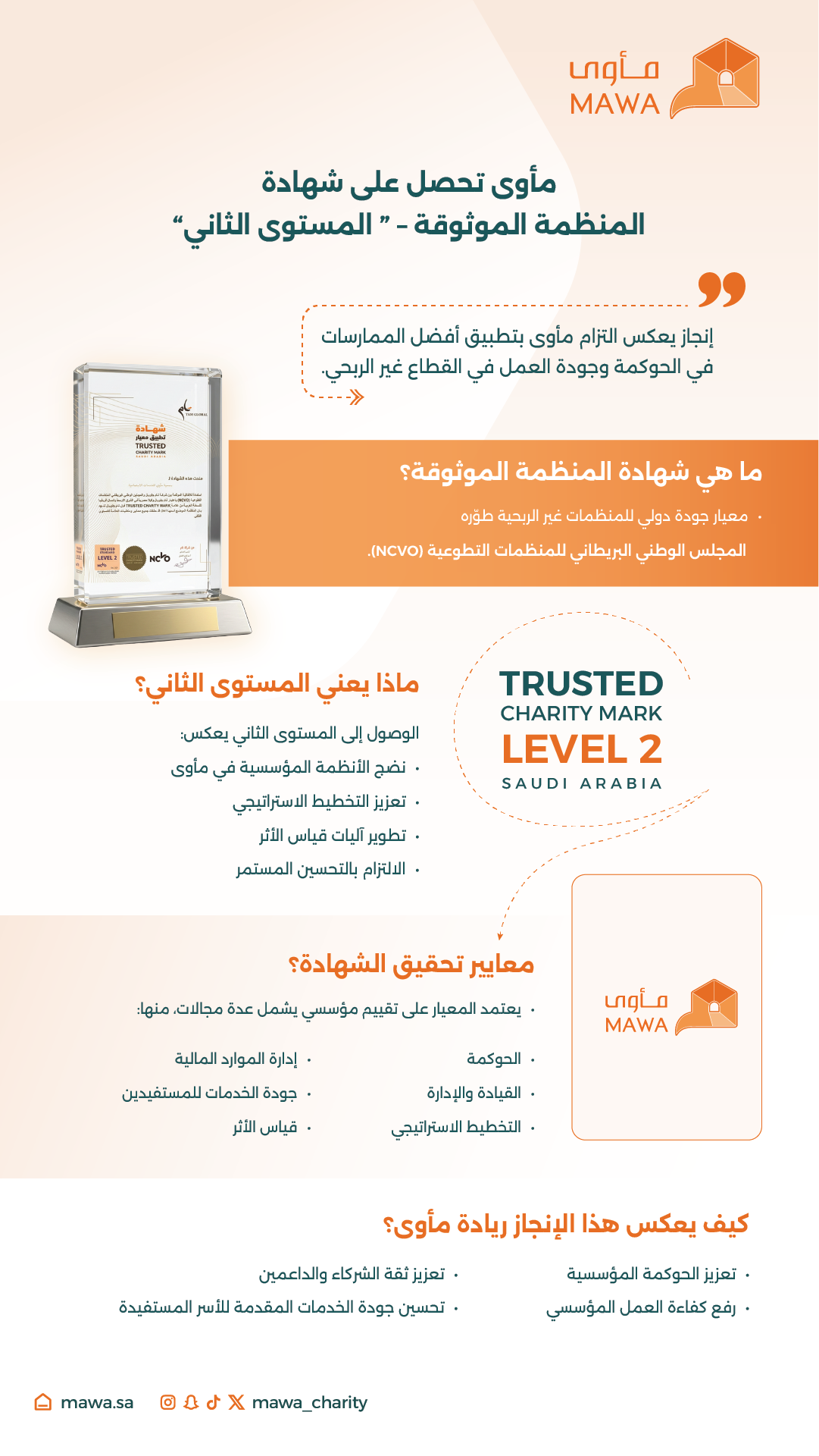 حصلت مأوى للخدمات الاجتماعية على شهادة المنظمة الموثوقة (TRUSTED) بالمستوى الثاني، بعد اجتيازها تقييمًا مؤسسيًا شاملًا يعكس التزامها بتطبيق أفضل الممارسات في الحوكمة المؤسسية وتعزيز كفاءة العمل في القطاع غير الربحي.